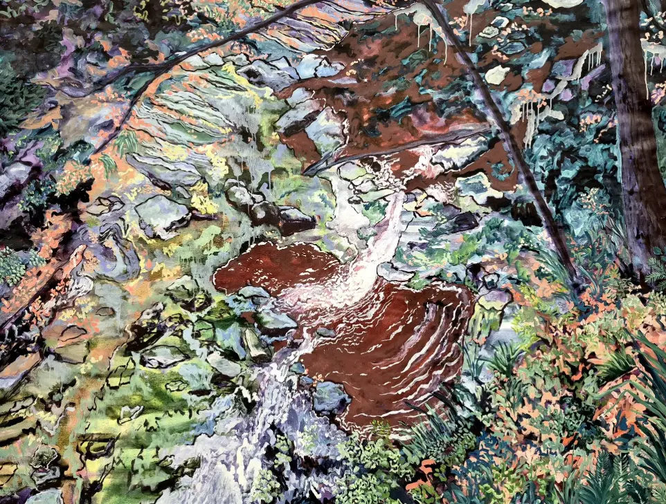 Peintre et géologue Maud Le Bel y présente cinq toiles de grand format, fruits de l’observation attentive des paysages ardennais belges, dans lesquels rochers, végétation et eaux ferrugineuses dialoguent immuablement.