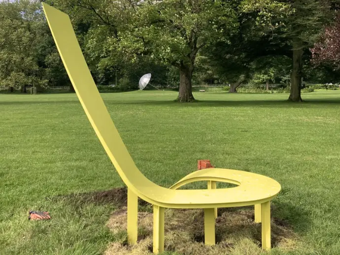 L’oeuvre Ruban Hauster est une grande sculpture utilisable par le public, à l’aspect élancé́ et joyeux par sa forme et sa couleur jaune. Dans ses recherches, l’artiste a d’abord considéré la question environnementale, le cycle de l’air entre le ciel et la terre, ce qui l’a amenée à réfléchir en termes de mouvement. Elle a pensé à une assise, à un banc-sculpture qui garderait ce mouvement ascensionnel, ce geste.