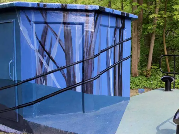 En continu est une fresque peinte sur une structure octogonale. Le spectateur est invité à se déplacer tout autour de la structure. Les huit peintures agissent alors comme un découpage des différentes perceptions qui s’offrent au promeneur, dans son cheminement. Elles interagissent avec l’environnement immédiat, empruntant au Parc de Hauster des éléments qui le caractérisent. Les peintures dialoguent ainsi tantôt en miroir, tantôt en prolongement, tantôt en décalage avec l’espace et ses perspectives.