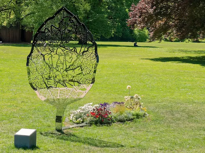 Nathalie Auzépy a imaginé une feuille de ville à partir de la structure de Chaudfontaine. En réunissant deux concepts fréquemment opposés, la nature et les espaces habités, elle cherche à instaurer une dialectique nouvelle entre l’environnement naturel et urbain. La réunion de ces deux concepts se fait autour de la notion de structure en se matérialisant dans les nervures des feuilles et dans le plan des villes ou villages.